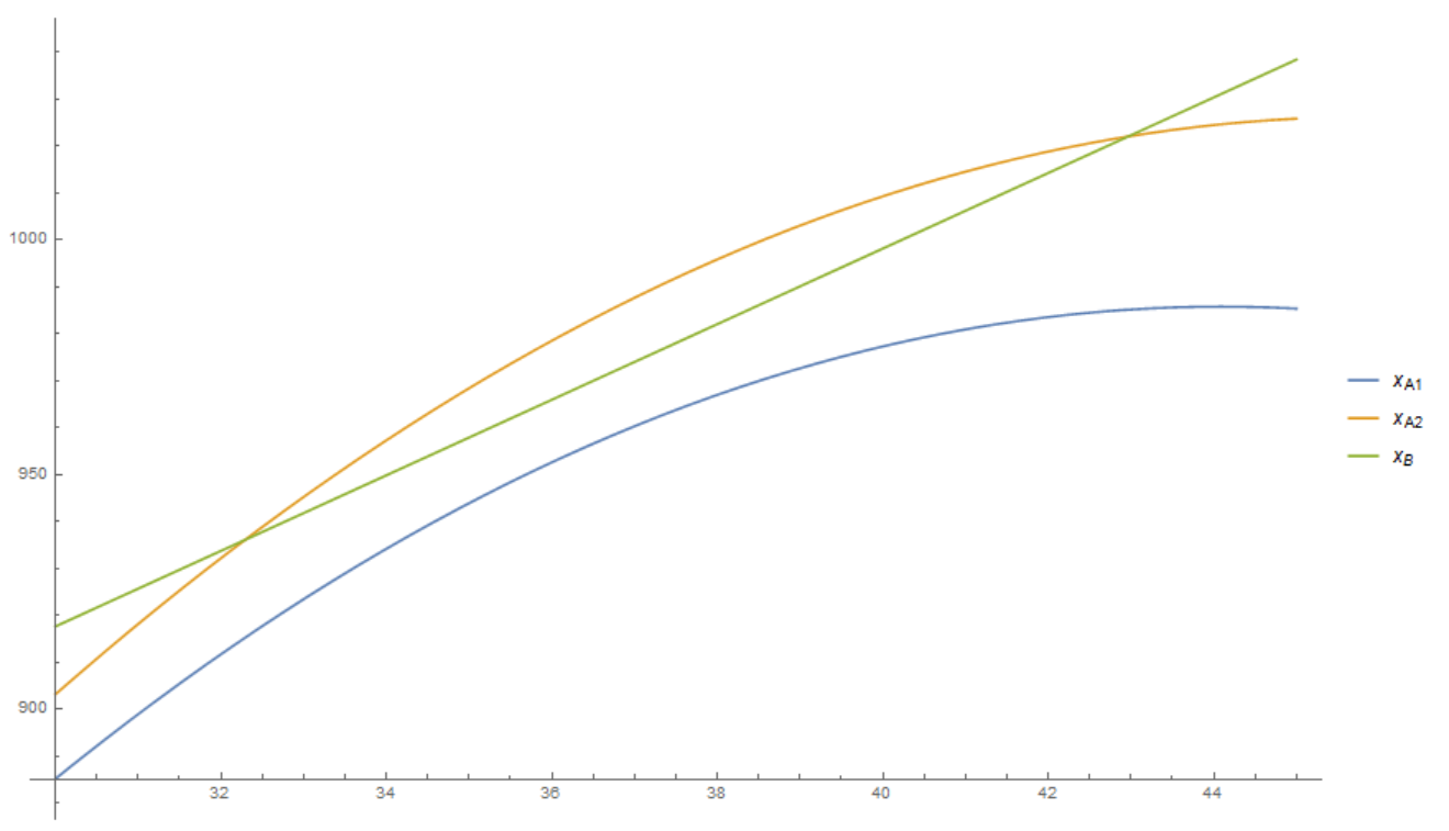 (b) $$ (2-43-2),$$ $$\begin{aligned} x_A(t)&=\frac{805}{18}t+\frac{1}{2}\(-\frac{3025}{3042}\)t^2\\ &=\frac{805}{18}t-\frac{3025}{6084}t^2\\ \end{aligned}$$ $$ (2-43-1),$$ $$x_B(t)=676+\frac{145}{18}t$$